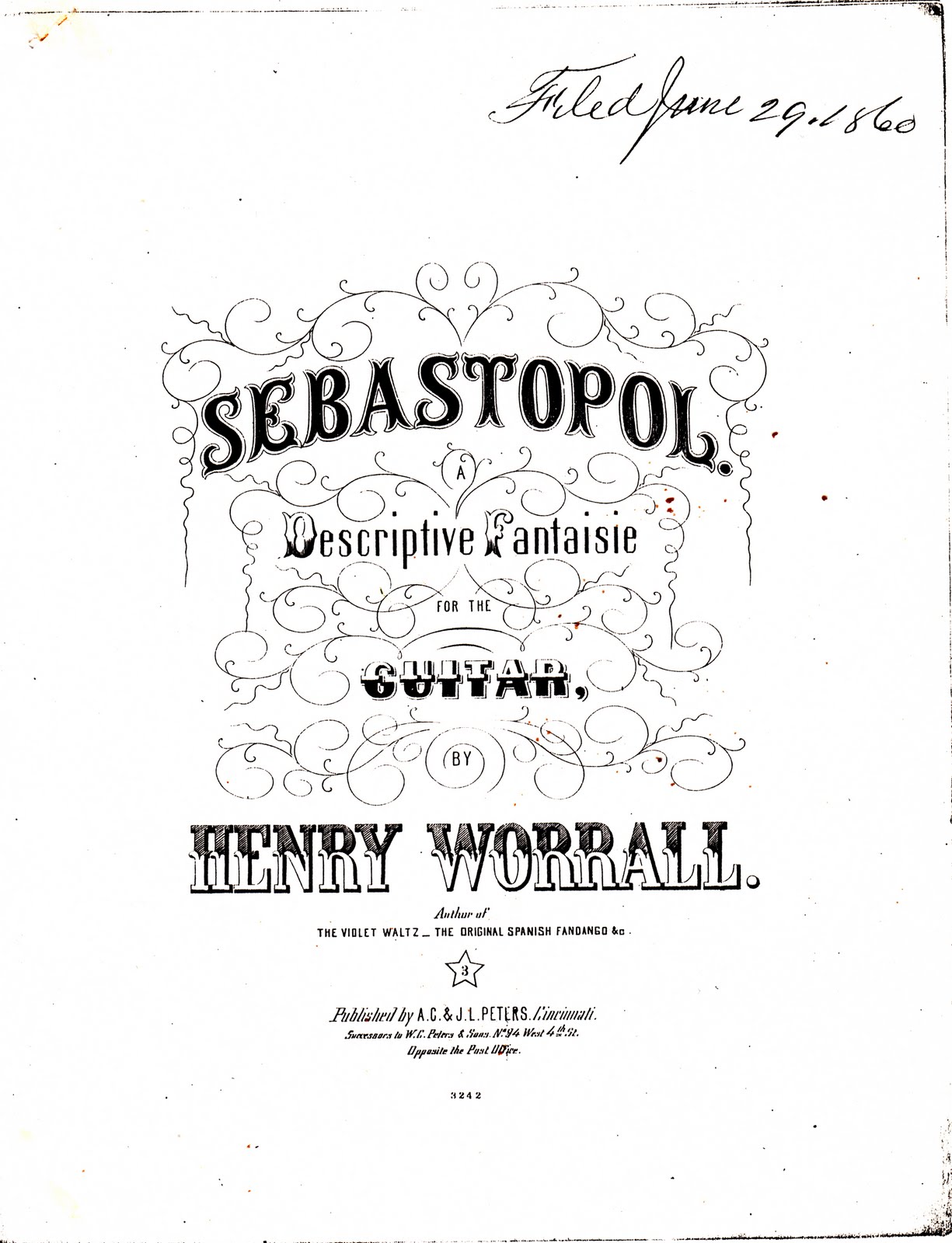 Worrall’s other copyright entry that day, “Sebastopol,” was composed several years earlier, when the Crimean War was raging. To commemorate the lengthy siege of the Russian city of Sebastopol (later spelled Sevastopol), Worrall composed a stately march that imitated a bugle and military marching band. He subtitled his piece a “Descriptive Fantaisie for the Guitar.” This time, the music instructed players to retune their guitar to open D so the song’s elegant treble-string melodies and chiming harmonics fell easily under the fingers. In its 1860 form, “Sebastopol” has little harmonic variation and sounds decidedly un-African, but its main melody and voice-leading approach to chords became staples for blues and folk performers as varied as Libba Cotten, Robert Wilkins, Mississippi John Hurt, and Furry Lewis.