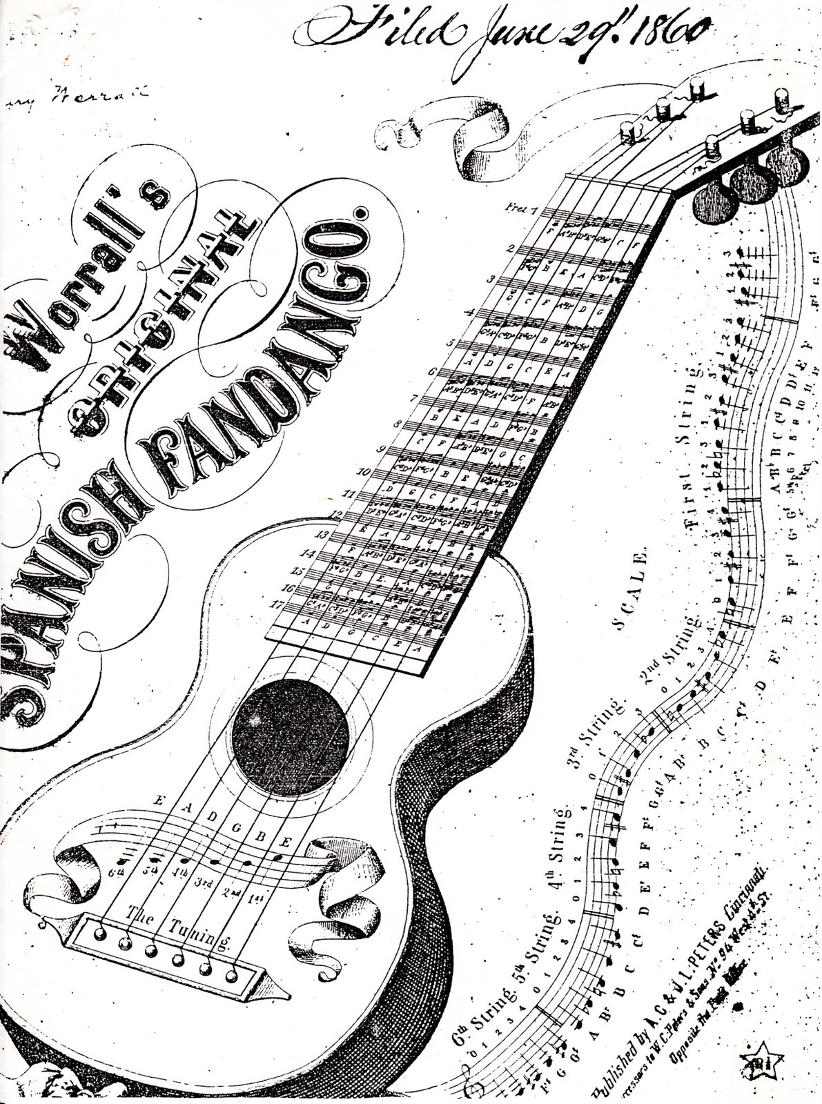 On June 29, 1860 Worrall walked into the Clerk’s Office of the Southern District Court of Ohio and filed copyrights for two instrumental guitar songs. “Worrall’s Original Spanish Fandango” called for the guitar strings to be tuned to an open-G chord (D, G, D, G, B, D, from low to high), with the explanation that the music was to be read as if the guitar were in standard tuning. Some of the song’s flourishes sounded like watered-down versions of earlier nineteenth-century European music. Its little alle vivace finale, for instance, could have worked as a Rossini opera coda. But with its lilting melody and easy chord changes, this song is clearly the direct ancestor of one of the most common blues strains.